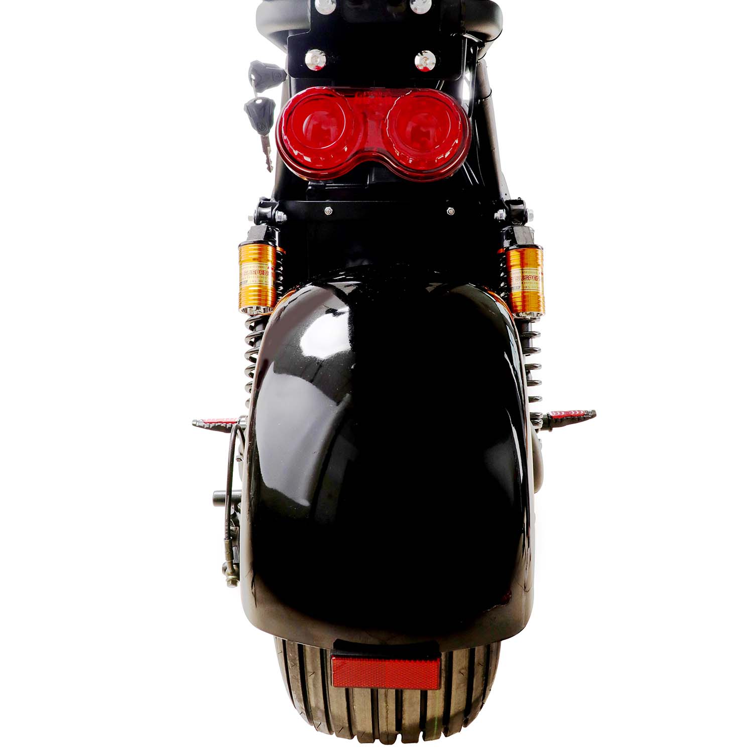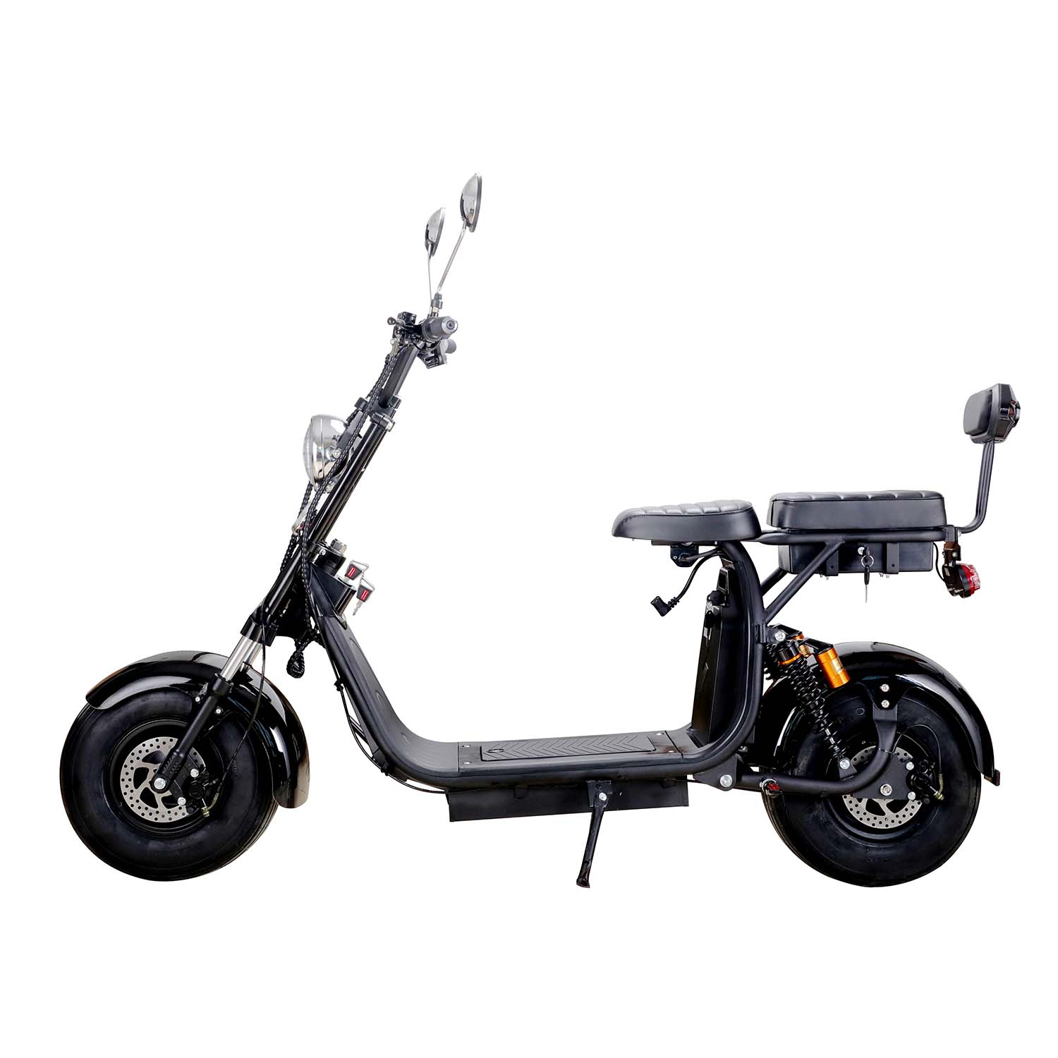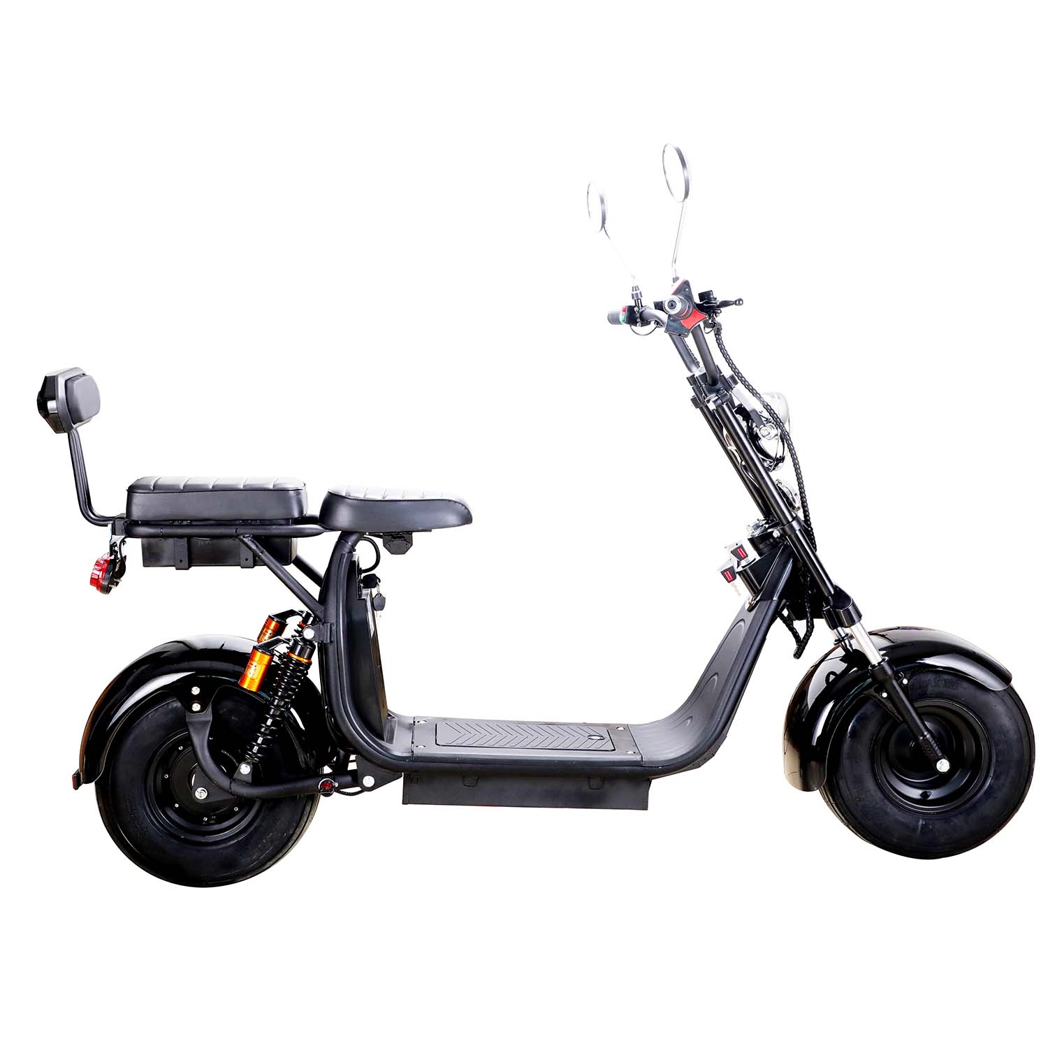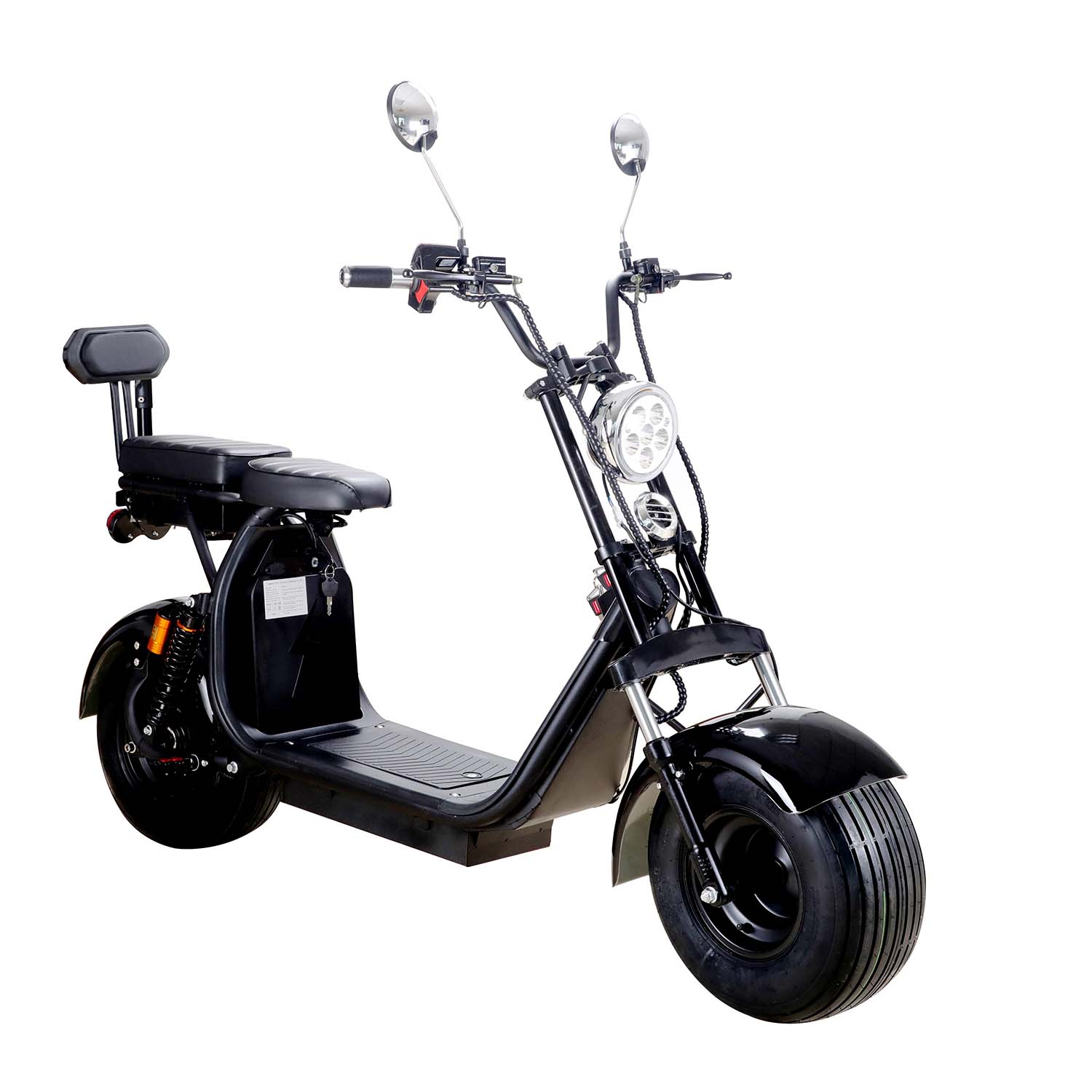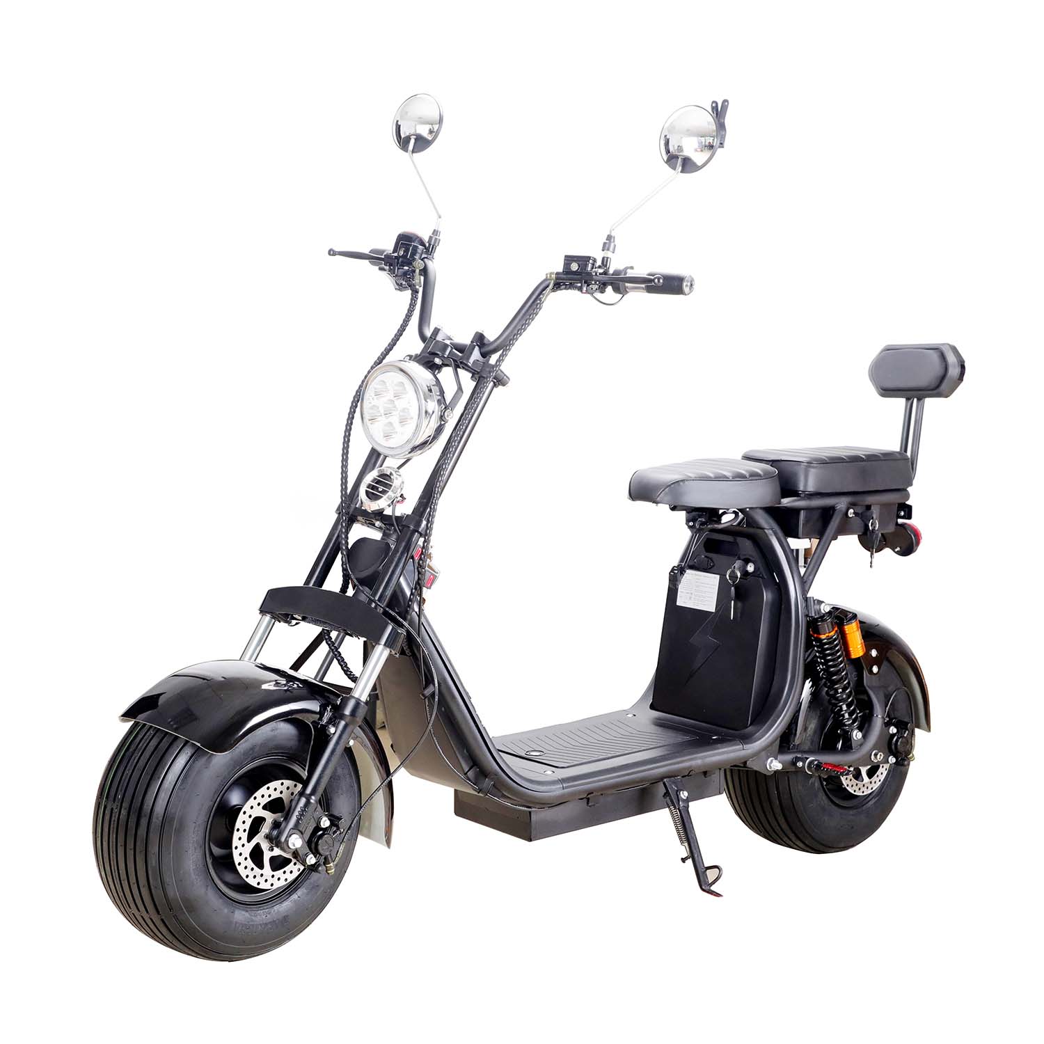 SAY YEAH KnockOut 2000w 60v Lithium Electric Scooter. This powerful hub motor, powered by a 60v 36ah Lithium Battery Pack (two batteries) can reach speeds of 25mph and travel up to 30 miles per charge. Equipped with a Front & Rear LED light, Front & Rear Shocks, Front & Rear Hydraulic Brakes, Huge Tires, Double Seat with Backrest, Under Seat Storage, Mirrors and Removable battery packs. This scooter is ready to tackle any terrain.